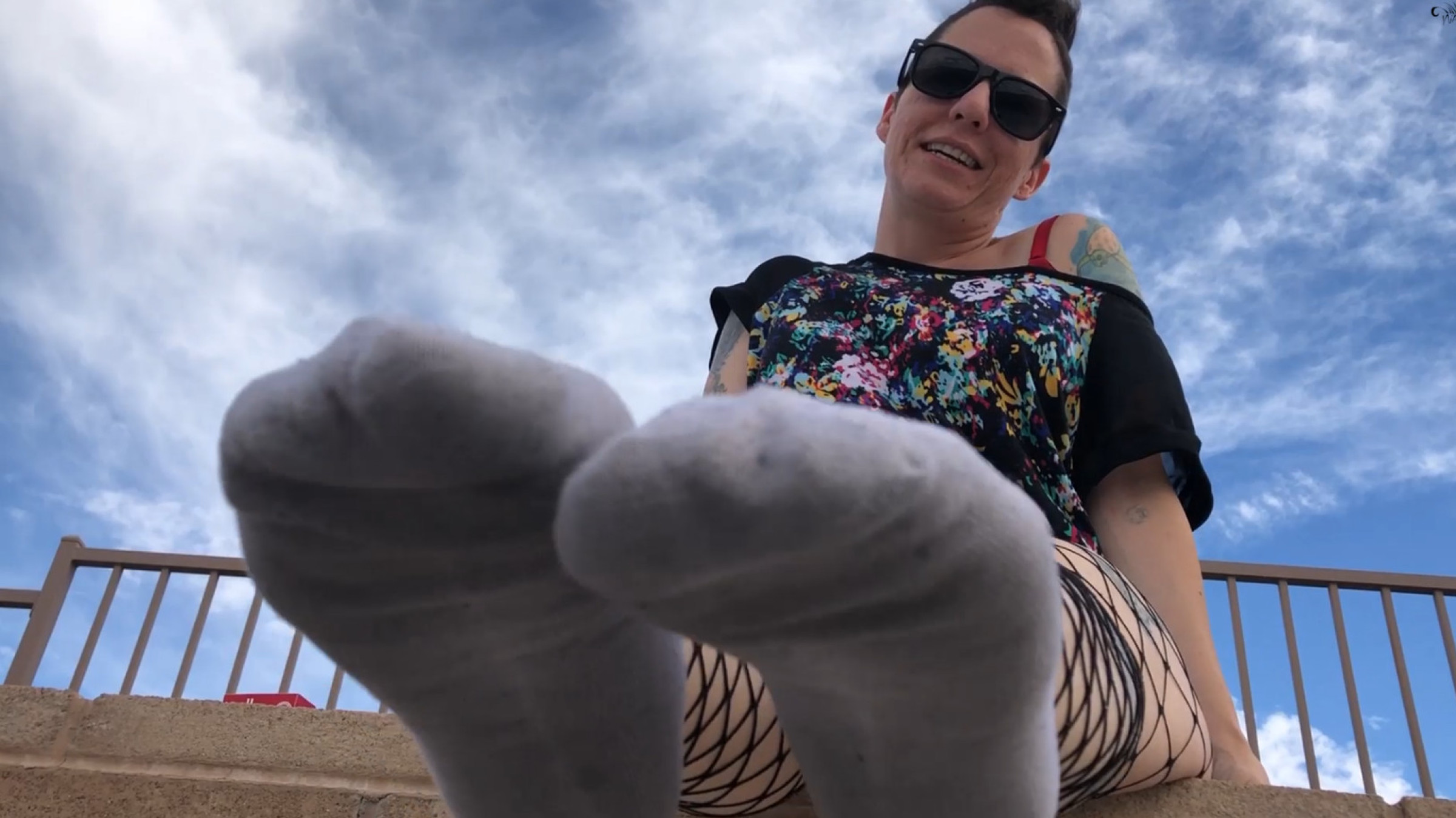 After a humid day of walking around the convention, I needed to air out my feet. We walked to the pier and there I took off my sandals and wiggled my toes to let the breeze through while I enjoyed the views! I'm stretching and scrunching my feet, as I climb on the railing just to tease you in my cute outfit while my feet get some rest!