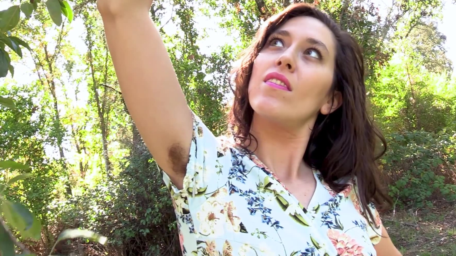 Caressa stretches in her sports bra and short shorts on a sunny day. She strips nude and gets in touch with the plants around her, playing with her big fluffy bush and armpit hair, showing it to you close up, before sitting back to masturbate outdoors!
