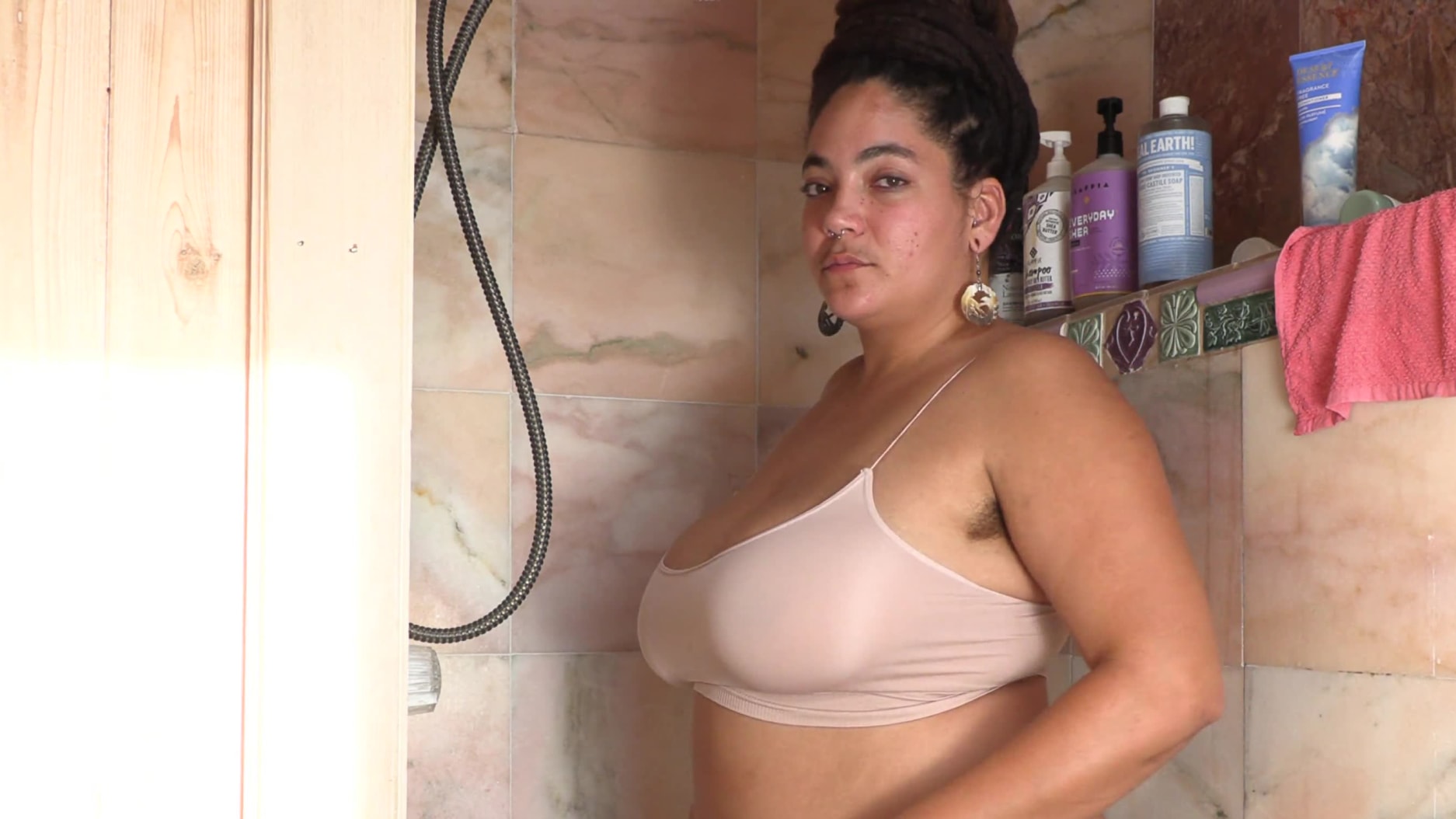 Zuri shows off their huge all-natural breasts and jet-black bush through their wet t-shirt and matching panties before stripping naked to suds up their hairiest parts.