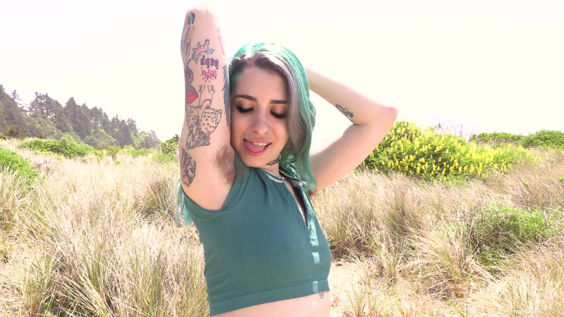 Pearl's at the beach and can't help but get turned on by the sound of the waves and the wind tickling her body hair. She strips down and finds the perfect rock to rub one out on.
