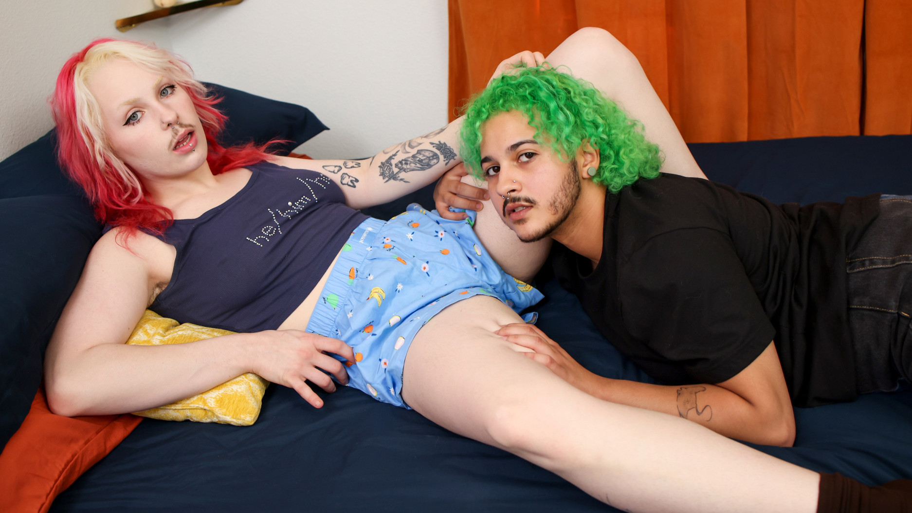 Salem Sabotage is your favorite green haired cutie, and we know you've been waiting to see him back on Transnificent, and today is your lucky day! Salem strips for you and shows off his festive undies, strokes and fingers you till you cum over and over, and then grabs his vibe so he can cum too!