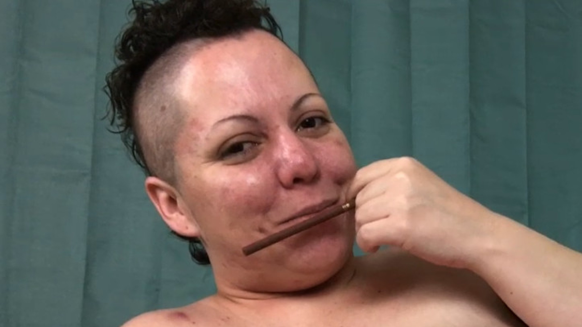 You didn't think anyone was home, and apparently neither did your stepsister. So when you walk into the bathroom, you catch her smoking cigarettes! You know shes an adult, but your stepmother would be so mad since it's her house! You see this as the perfect opportunity to convince her to strip for you. You make her smoke a couple cigarettes while she strips and starts to encourage you to jack off until you blow all over. Now you both have a secret to hide