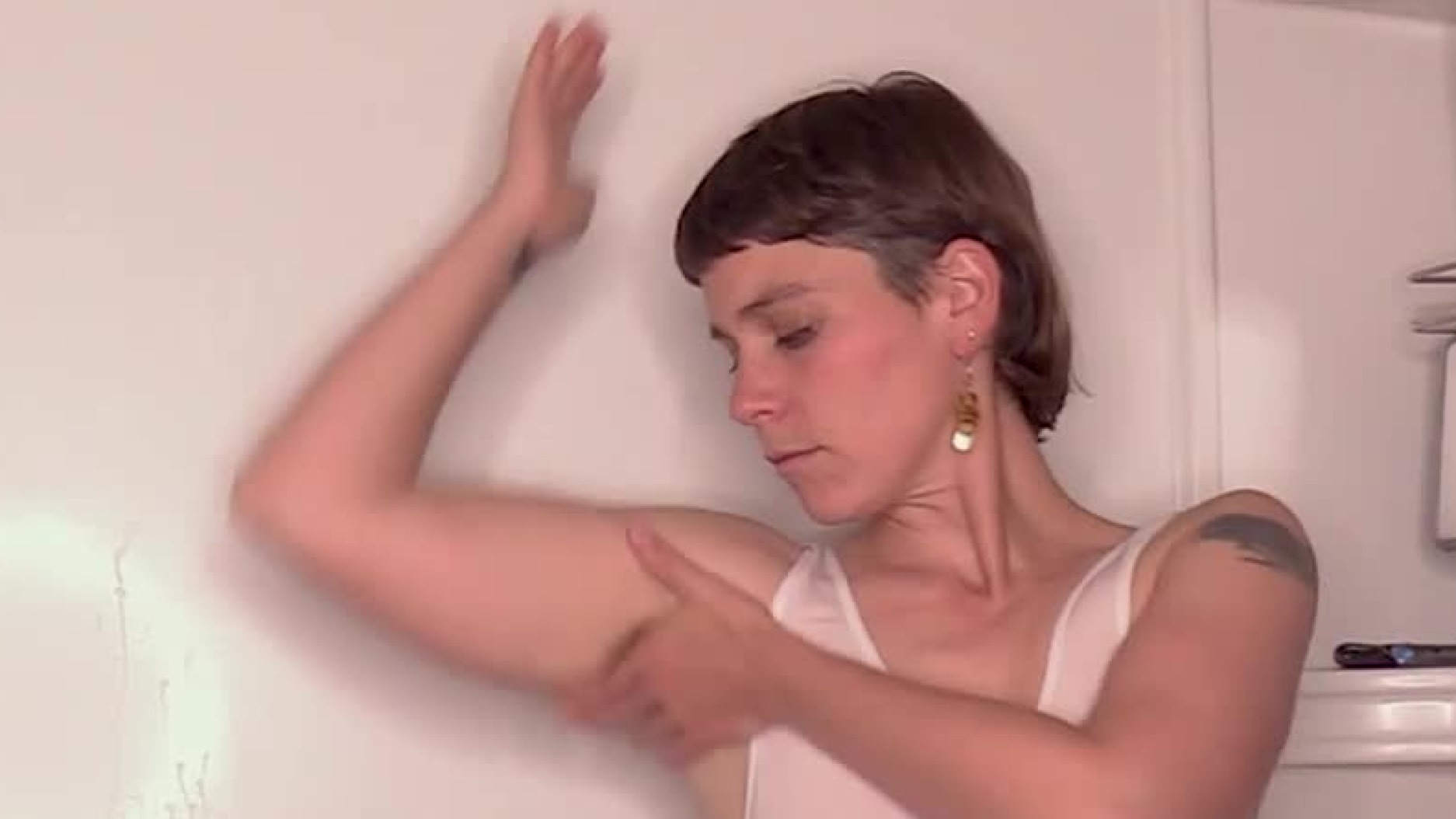 Cookie decides to do some yoga in my yard but it gets so hot here! She decides to take off her clothes, giving us lovely views of her hairy pits, and wide womanly hips while she bends over and stretches, finally getting on the ground to allow herself to release in a different way...