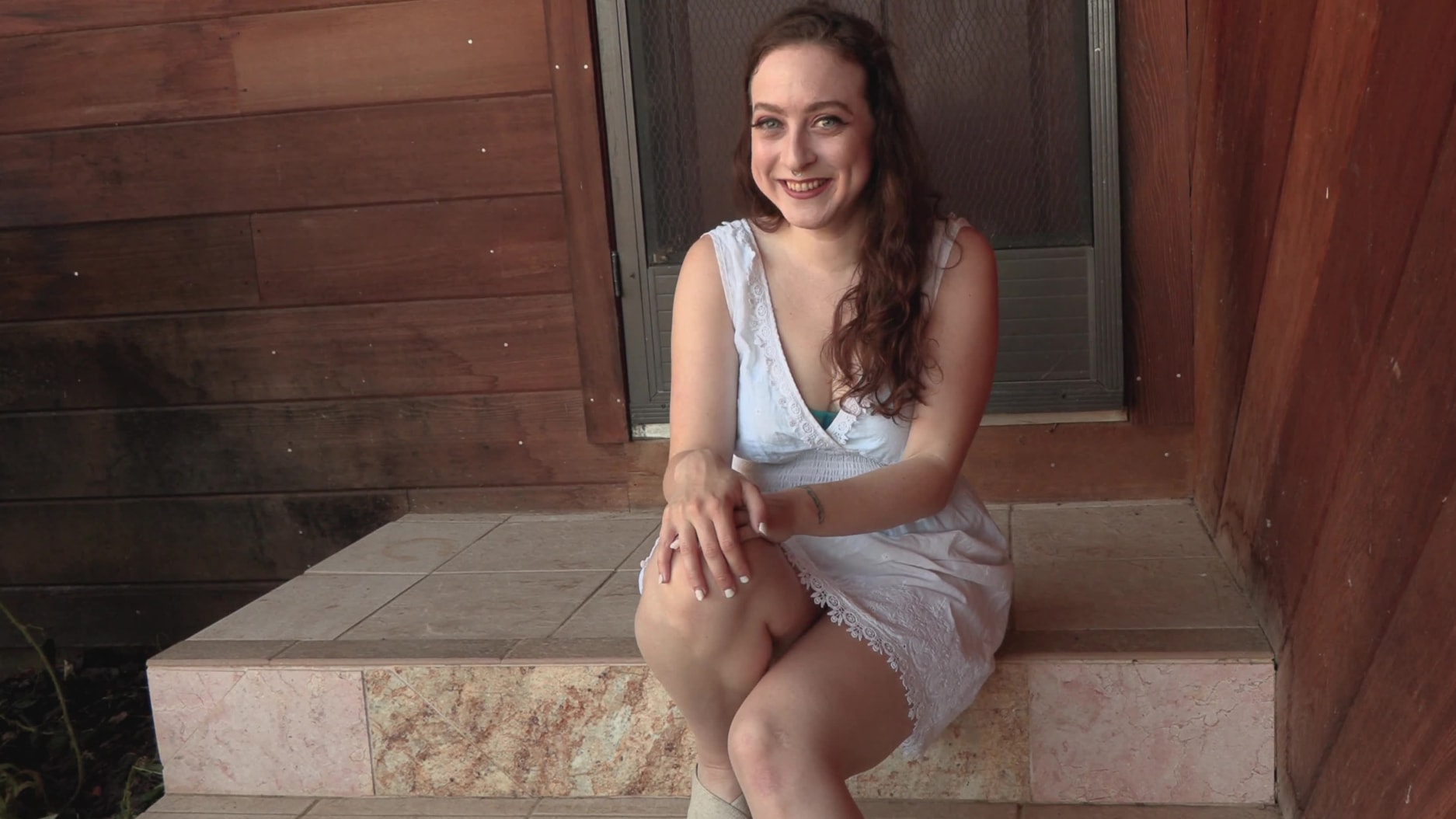 Delphine shows off her amazing busty, hairy body in my garden. I know you love gazing into her electric blue eyes while she moves and spreads for you...