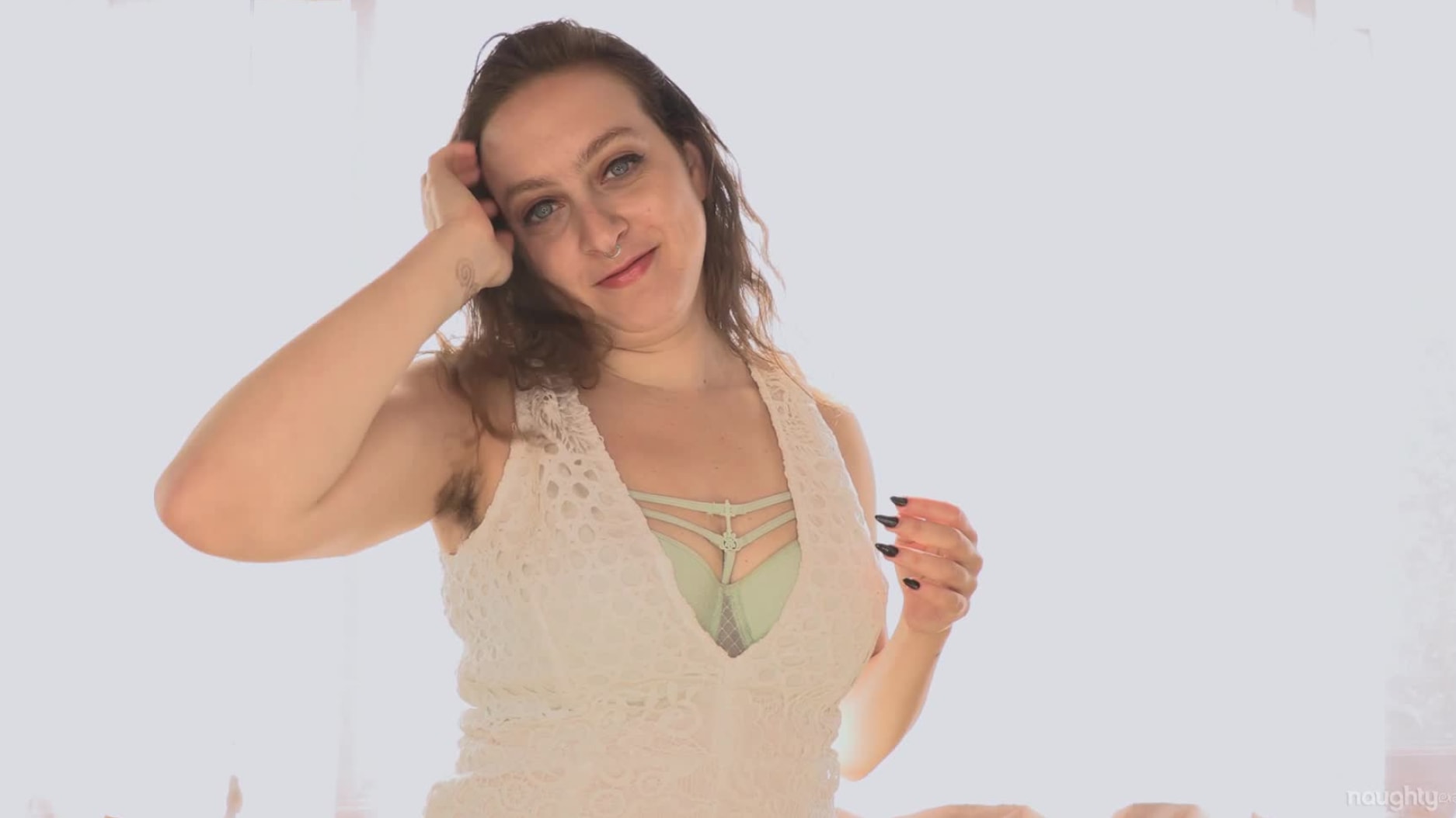 Delphine lays on my bed while I interview her about her body hair. She takes us for a tour of her hairy bits then spreads herself wide for a powerful orgasm.