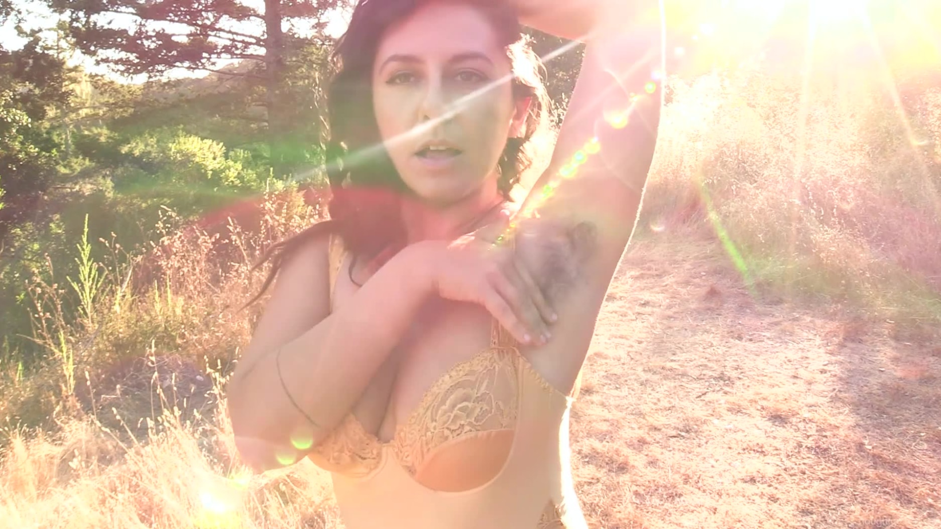 Bella looks amazing dancing in the setting sun, her very dark, black body hair set again the light. This gorgeous girl masturbates as the day ends.