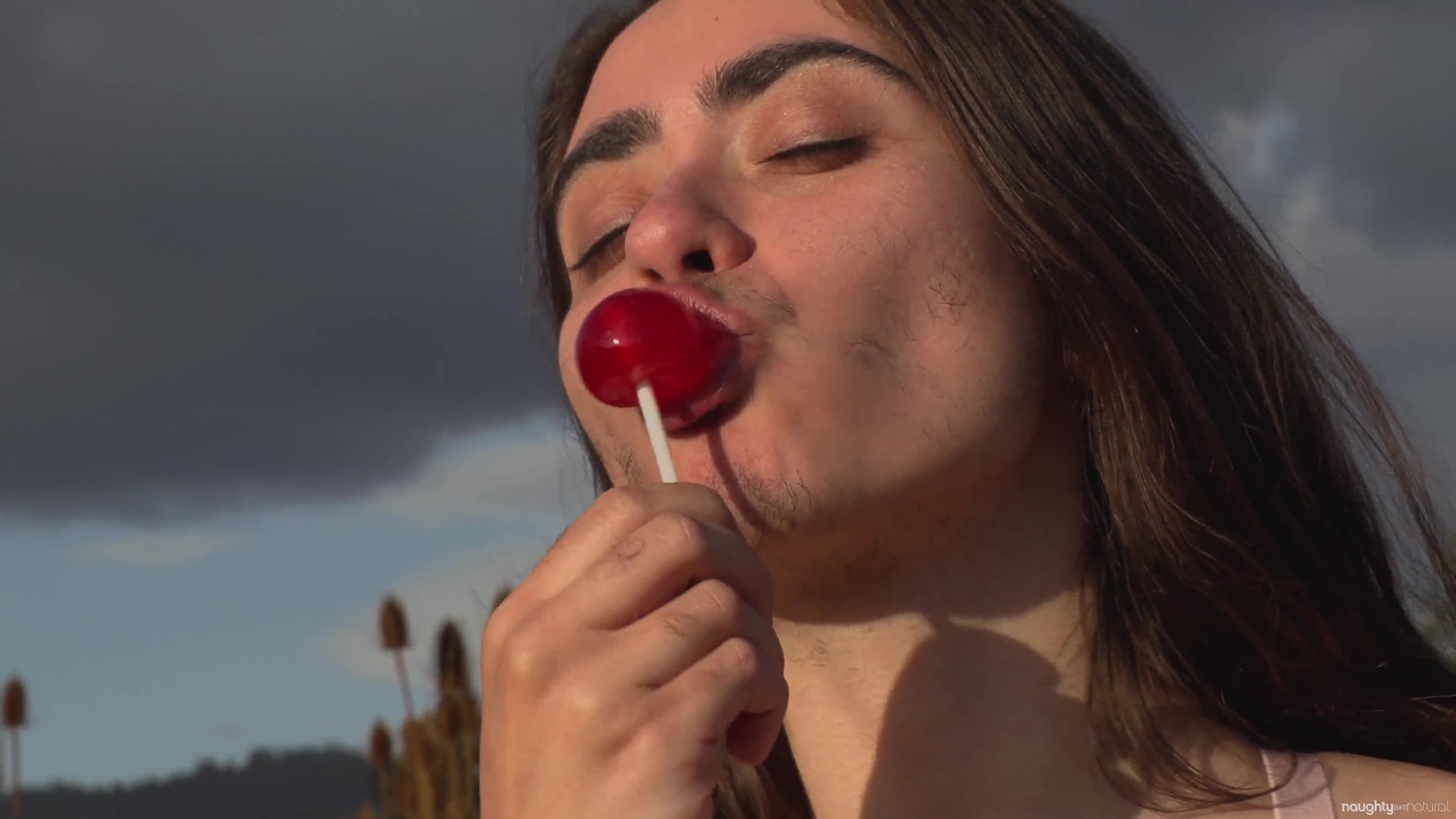 Kisa drenches herself in oil, rubbing it all over her hirsute body. You can see her body hairs glisten in the sunshine as she strokes and explores herself.