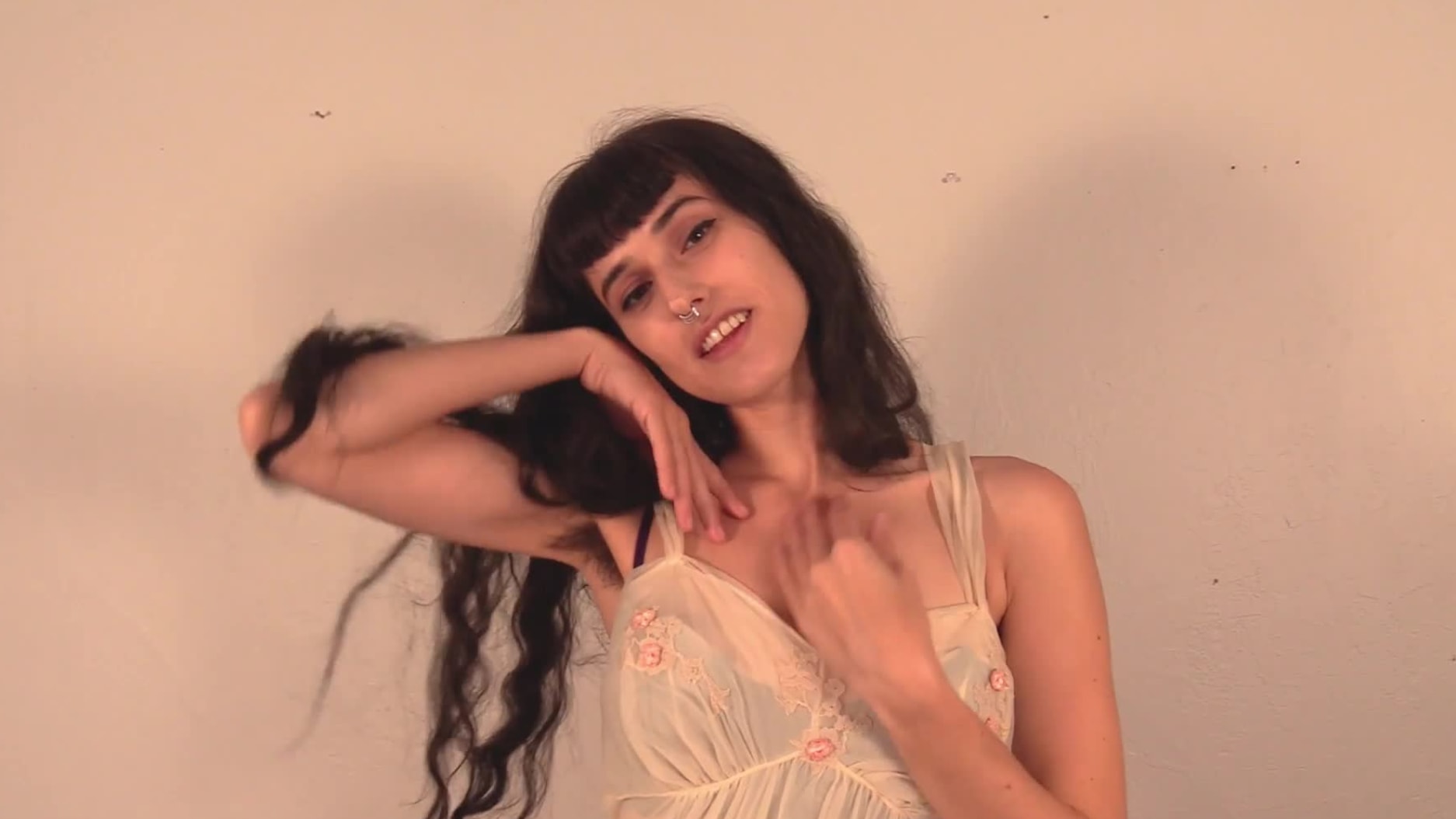 Bella looks amazing dancing in the setting sun, her very dark, black body hair set again the light. This gorgeous girl masturbates as the day ends.